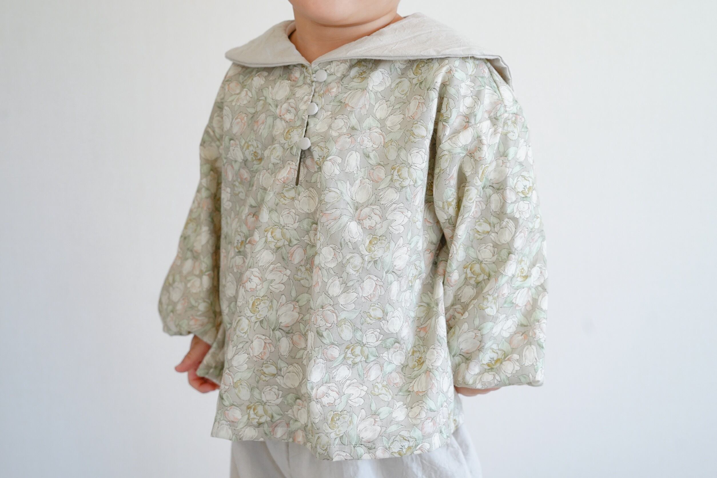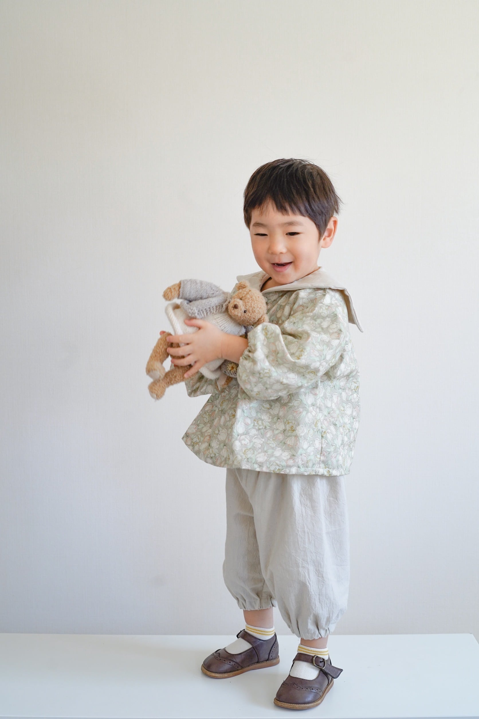 男の子にも可愛らしいチューリップ柄で着てもらいたくて。花柄ですがグレーとグリーンがベースなので可愛らしくなりすぎないでとってもおすすめです。